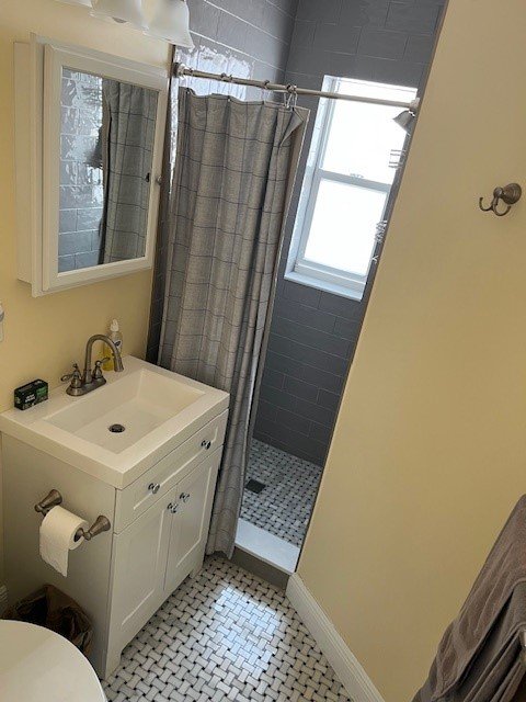 The bedroom has a queen bed and a TV. The bathroom and shower are made with tile and marble. There are tiled floors everywhere, and Wi-Fi is available in every room.